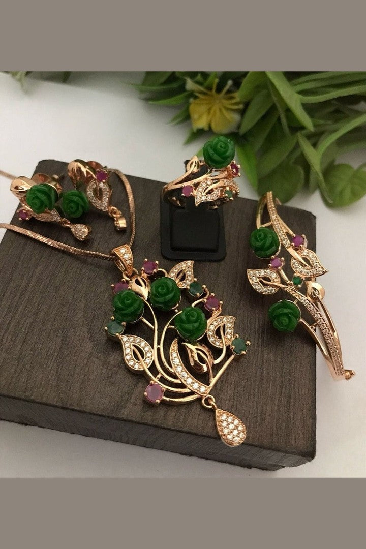 Introducing the Spring Combo, a stunning jewelry set crafted from a copper-based alloy and elegantly plated in rose gold. This exquisite collection features a beautifully embellished pendant, matching earrings, and an adjustable bracelet that fits sizes up to 2.4 and 2.6.